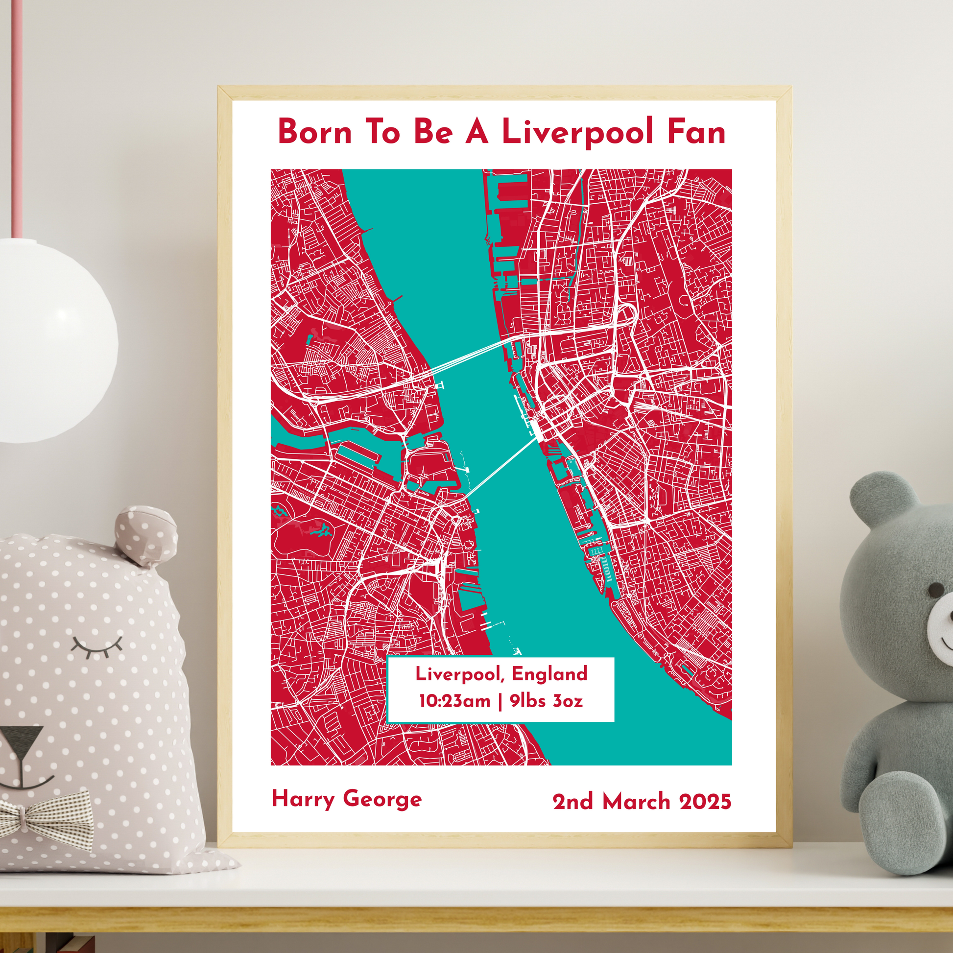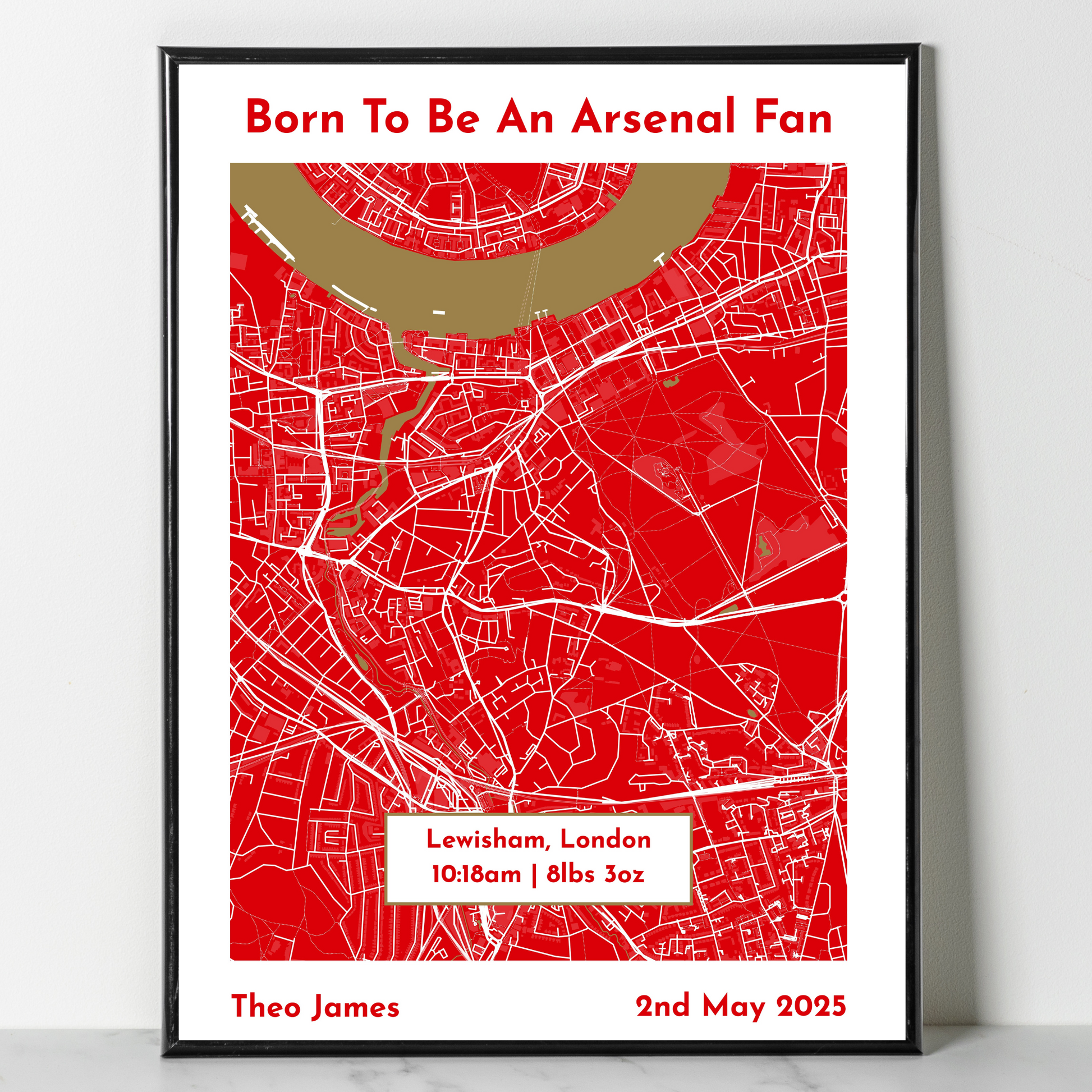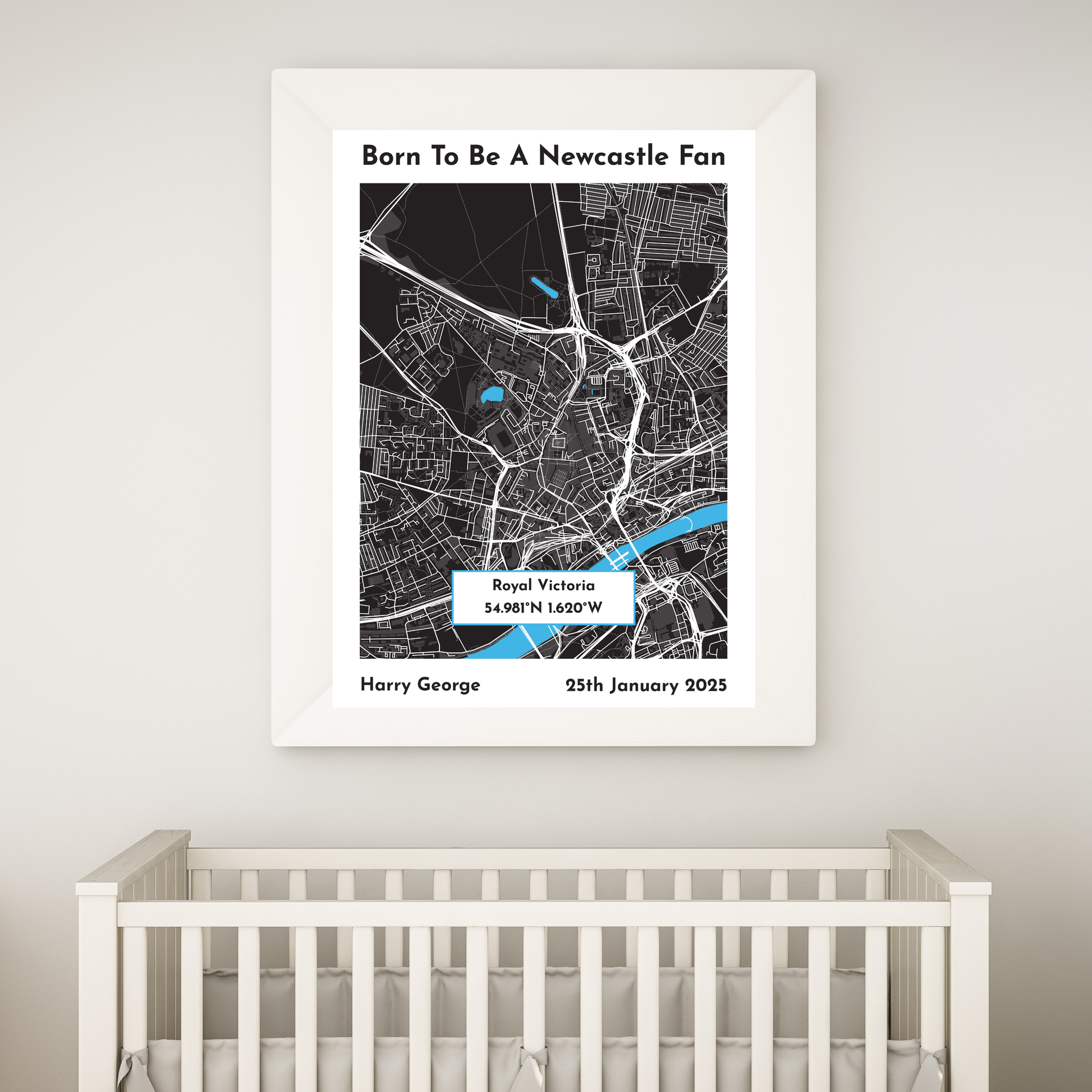 This is not your average nursery print. Our Born To Be A Fan artwork celebrates your baby’s arrival and their future as a loyal supporter – all in one stylish, custom piece. Featuring a map of where they were born, beautifully coloured in the shades of your chosen football club, it’s a unique way to show they were quite literally born into it.